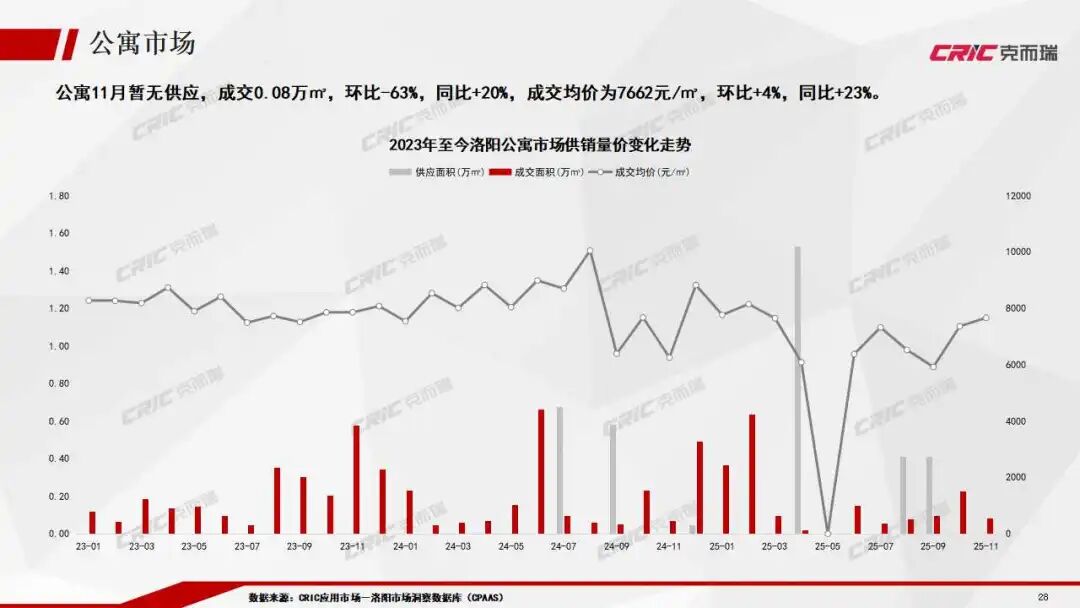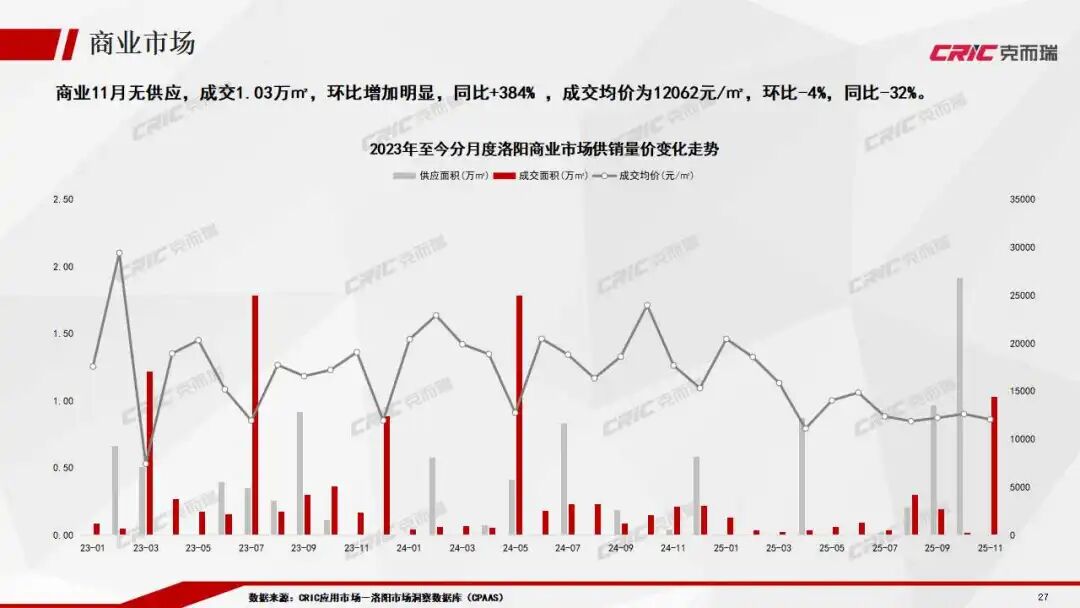 11月商業無供應但成交量激增,均價環比小幅下滑。公寓市場則量跌價漲,雖體量較小,但市場韌性較好。