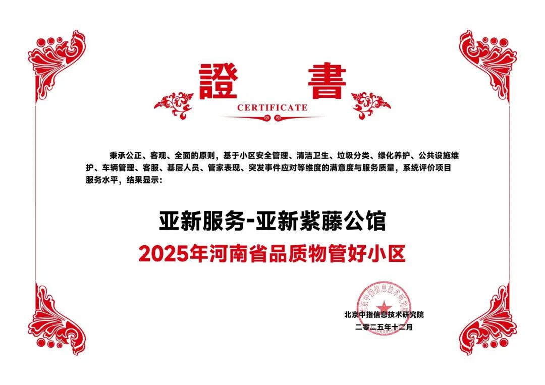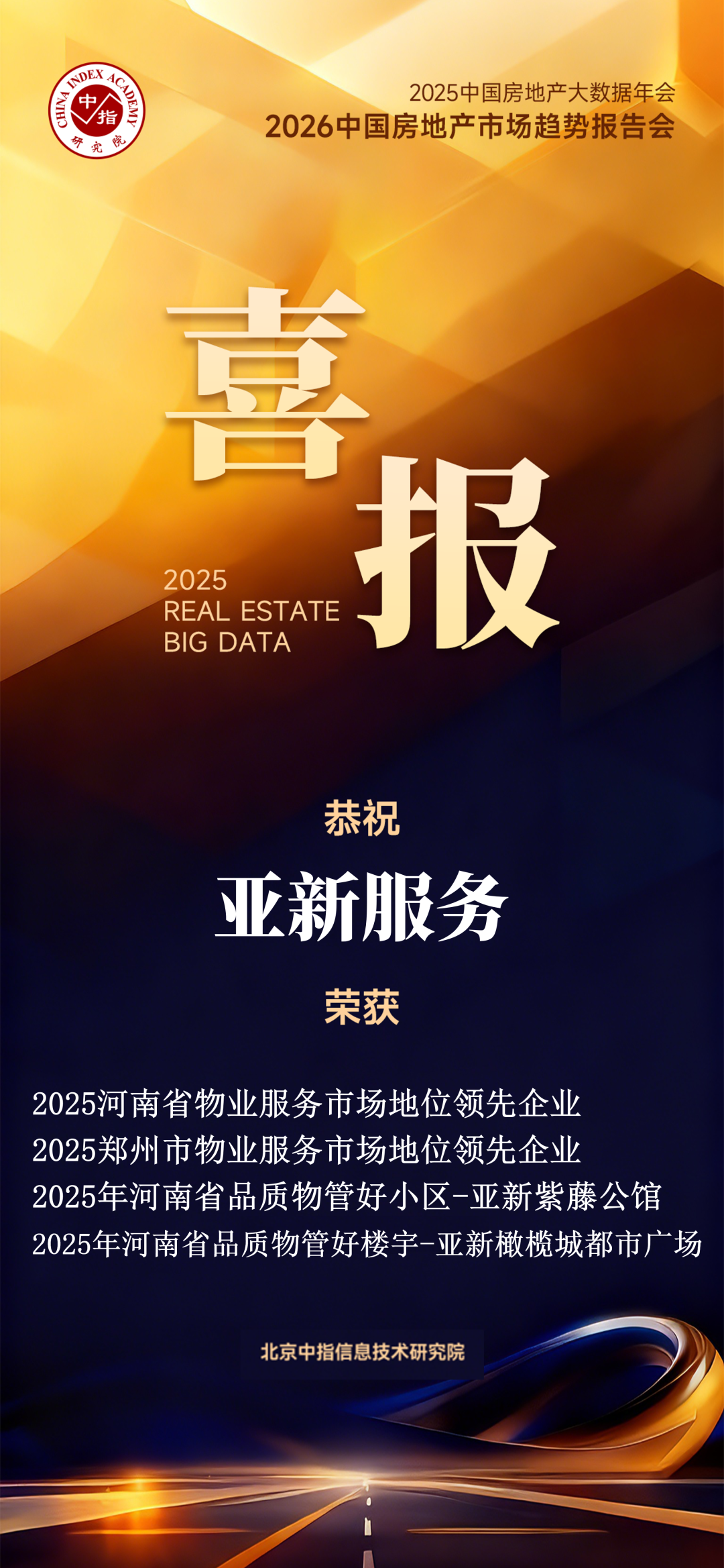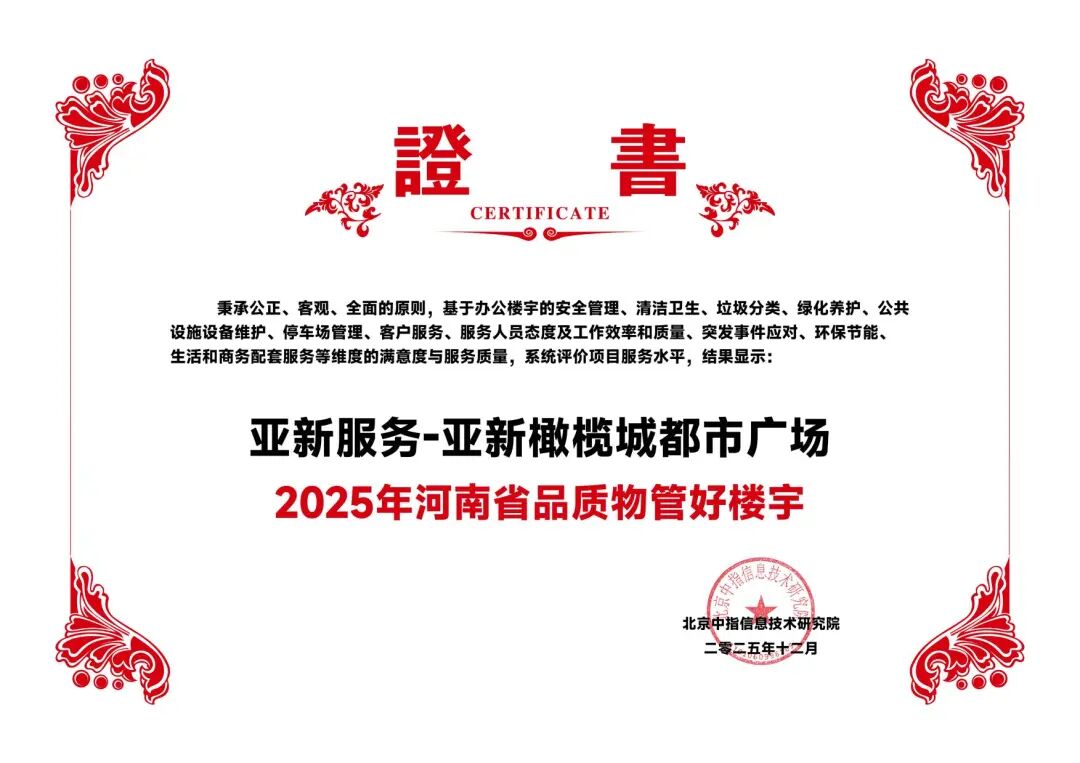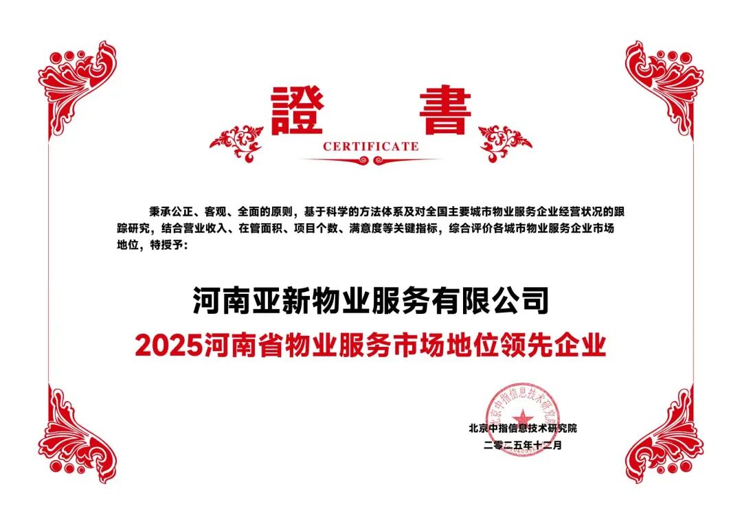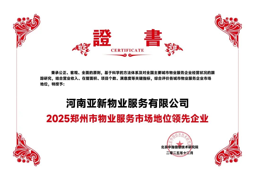 亞新服務憑借創新領先的紅色物業服務模式及高品質服務,榮獲“2025河南省物業服務市場地位領先企業”、“2025鄭州市物業服務市場地位領先企業”、“2025年河南省品質物管好小區-亞新紫藤公館”、“2025年河南省品質物管好樓宇-亞新橄欖城都市廣場”多個獎項。