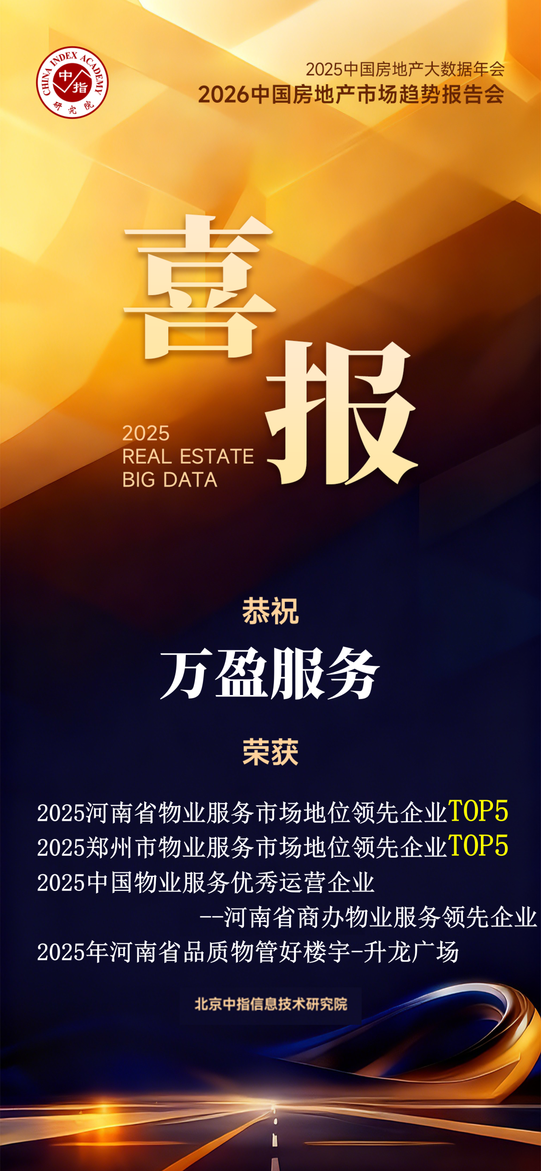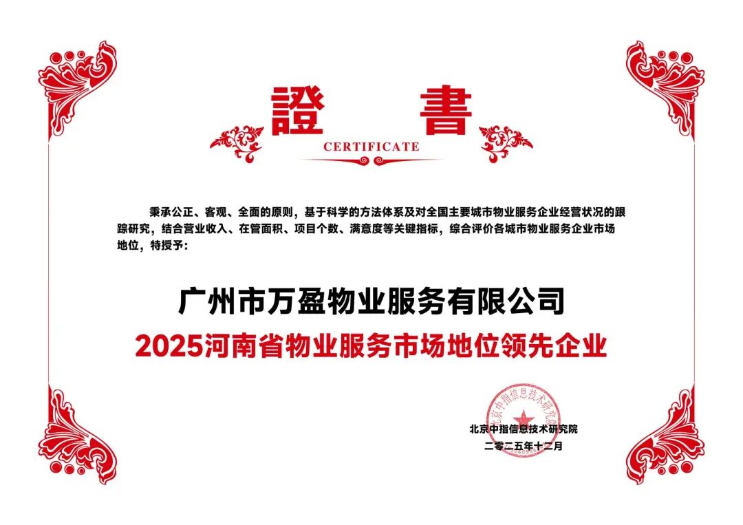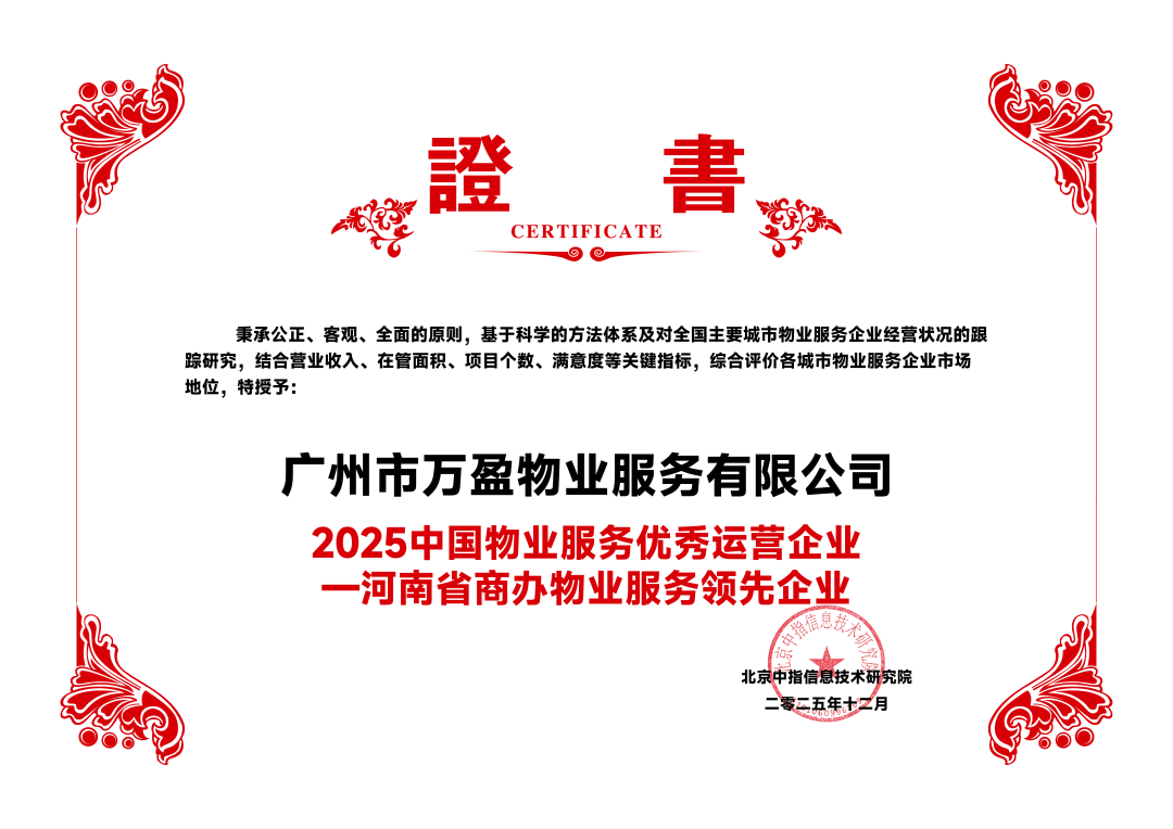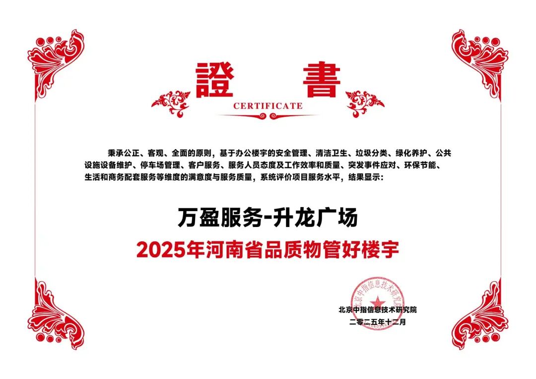 萬盈服務憑借良好的客戶口碑及在商寫物業領域專業的服務水平榮獲“2025河南省物業服務市場地位領先企業”、“2025鄭州市物業服務市場地位領先企業”、“2025中國物業服務優秀運營企業-河南省商辦物業服務領先企業”、“2025年河南省品質物管好樓宇-升龍廣場”獎項。