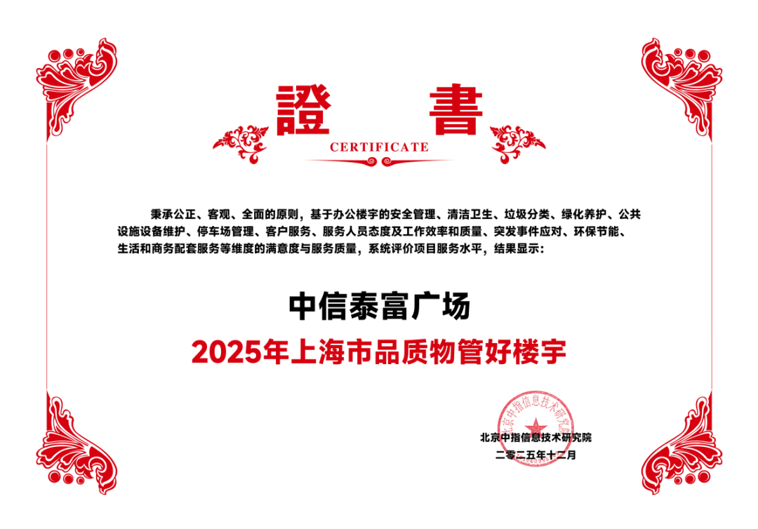 2025年12月11日,由北京中指信息技術研究院主辦,中國房地產指數系統、中國物業服務指數系統承辦的“2025中國房地產大數據年會暨2026中國房地產市場趨勢報告會”在北京召開。中信泰富物業在管的中信泰富廣場,憑借超高的滿意度和優秀的專業管理能力榮獲“2025年上海市品質物管好樓宇”專項榮譽。