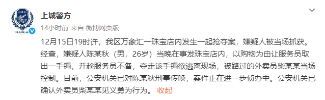 12月16日凌晨,上城警方發(fā)布通報(bào):12月15日19時(shí)許,我區(qū)萬(wàn)象匯一珠寶店內(nèi)發(fā)生一起搶奪案,嫌疑人被當(dāng)場(chǎng)抓獲。