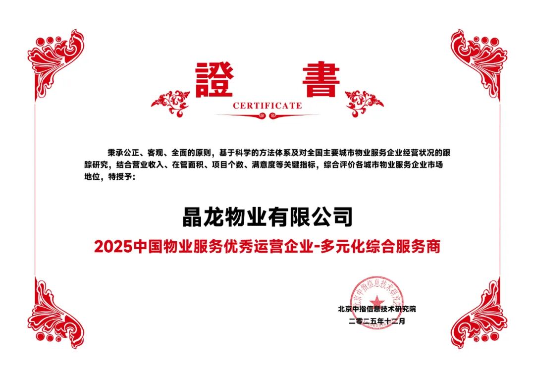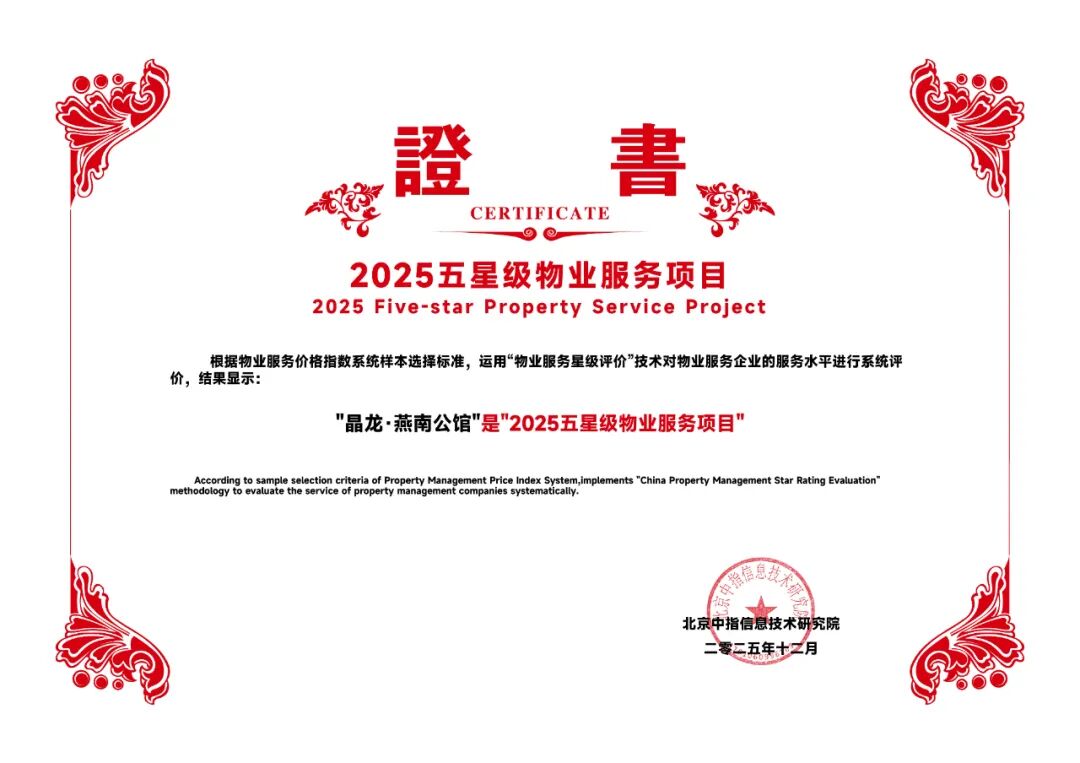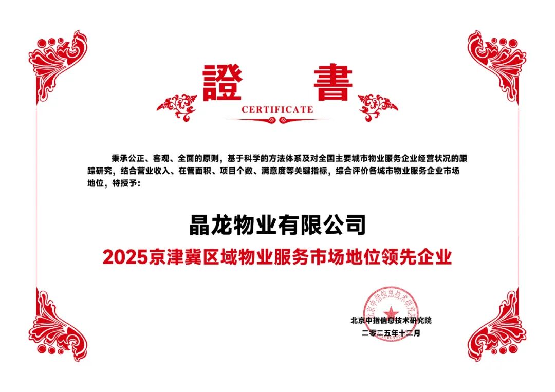 在本次研究中,晶龍物業有限公司(簡稱:晶龍物業)憑借著穩健的綜合實力、強勁的品牌影響力和高品質服務力,榮膺“2025中國物業服務優秀運營企業—多元化綜合服務商”和“2025京津冀區域物業服務市場地位領先企業”,其在管項目晶龍·燕南公館憑借卓越的服務表現,榮膺“2025五星級物業服務項目”。