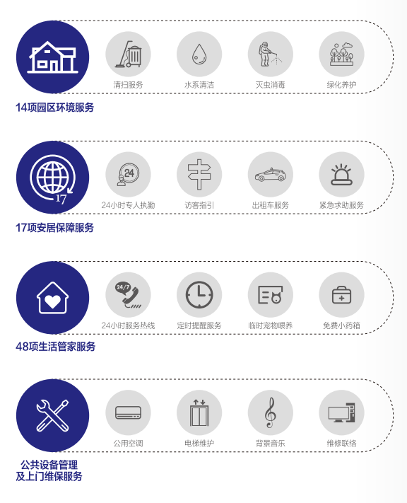 17項安居保障服務:24小時專人執勤、訪客指引、泊車服務、緊急求助服務