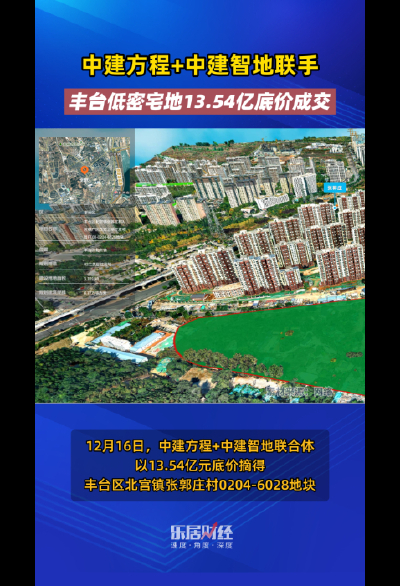 12月16日,北京豐臺區一宅地出讓,規劃建筑面積47754㎡,容積率1.5,限高24m(局部30m),起始價13.54億元,起始樓面價28354元/㎡。最終中建方程投資發展集團有限公司和中建智地置業有限公司聯合體以底價13.54億元競得該地塊,成交樓面價28354元/㎡。(人民財訊)