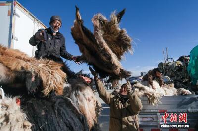 圖為牧民們正忙碌地從貨車上卸下各類畜牧產(chǎn)品