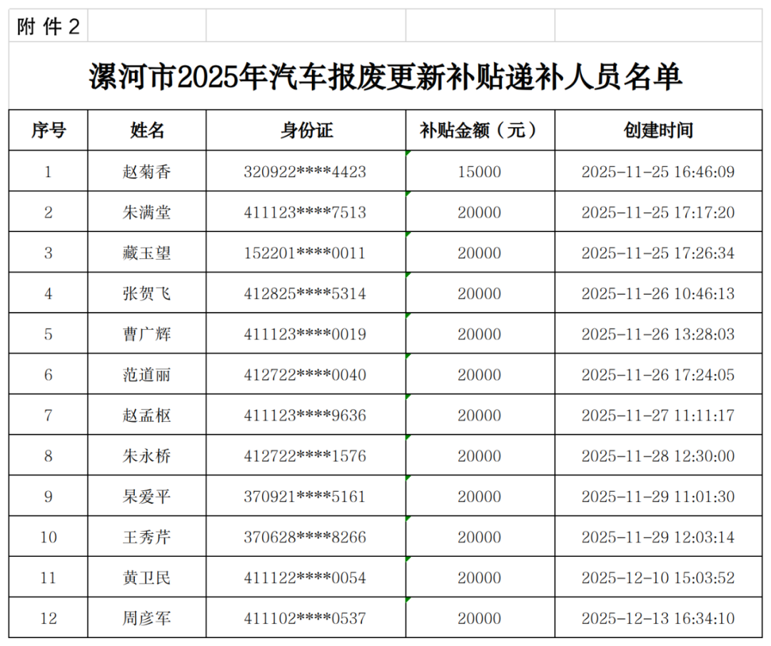 目前,審核人員已完成首輪集中審核,對逾期未補正的8個申請(名單見附件1)終止受理,對釋放出的補貼額度結合我市消費品以舊換新其他領域結余資金,共計統籌調劑25.8萬元用于汽車報廢更新補貼遞補工作。經統計,遞補資格對應的申請人范圍為:首次提交申請材料創建時間在2025年11月25日16時19分11秒后的申請人,共計12人(名單見附件2)。