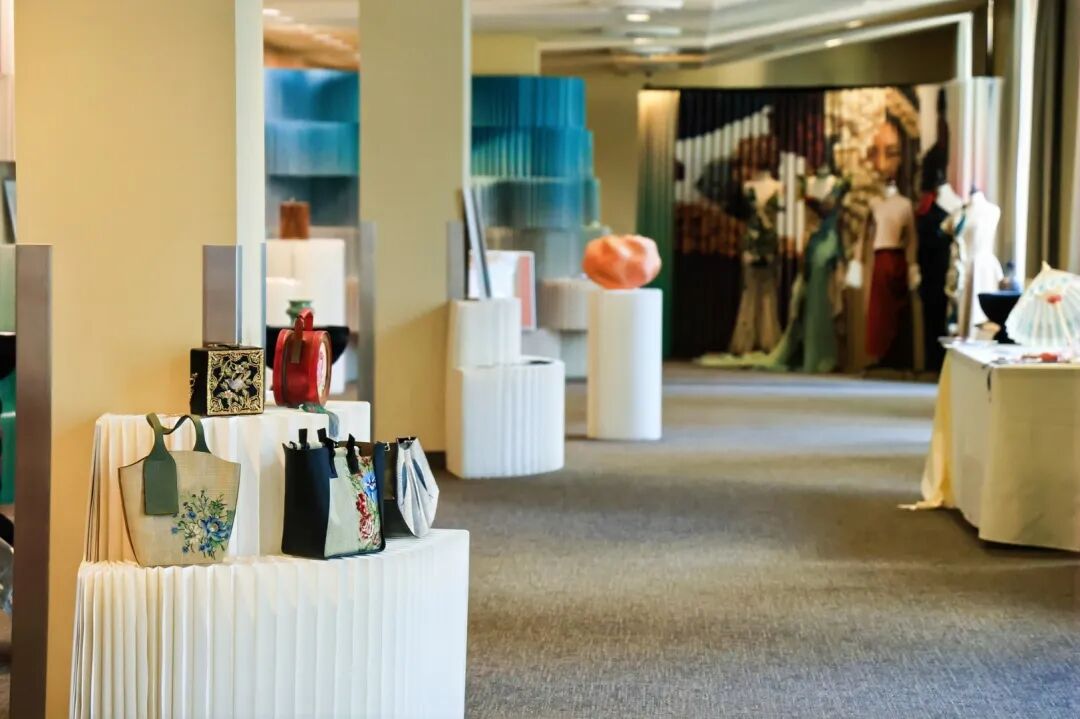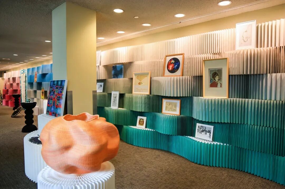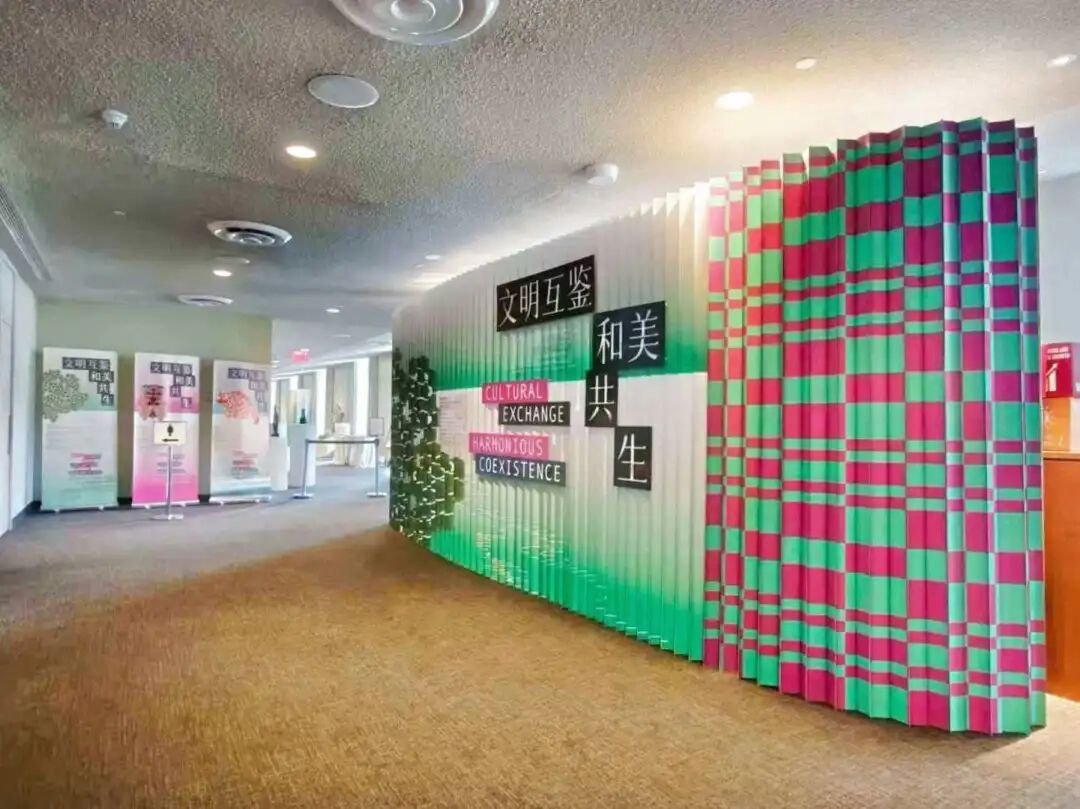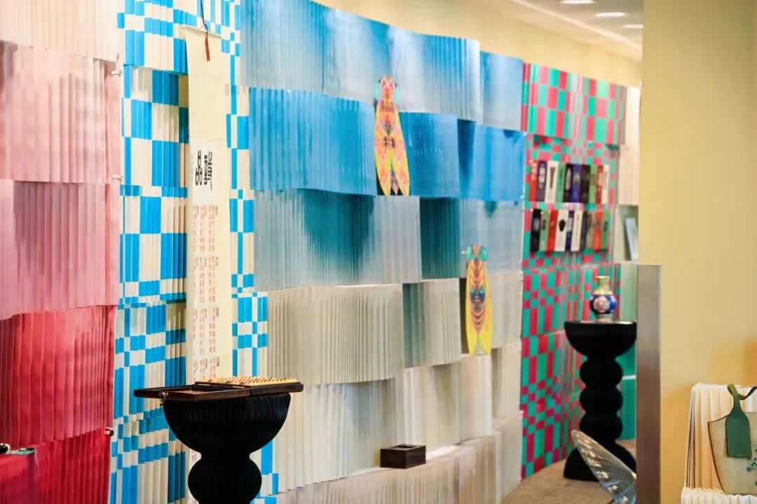 作為此次聯合國特展受邀方,“十八紙”將東方色彩與文化圖騰融入創作,以契合特展主題的彩印風琴屏風、輕漾屏風為媒,結合圓柱展架、長條展架、階梯展架等紙藝美陳,在聯合國總部4樓展廳中,以輕盈、靈動、至美的特質結構,重新定義了人與空間、人與物、人與自我的關系,構建起了一個東方意境與現代美學的紙藝空間。