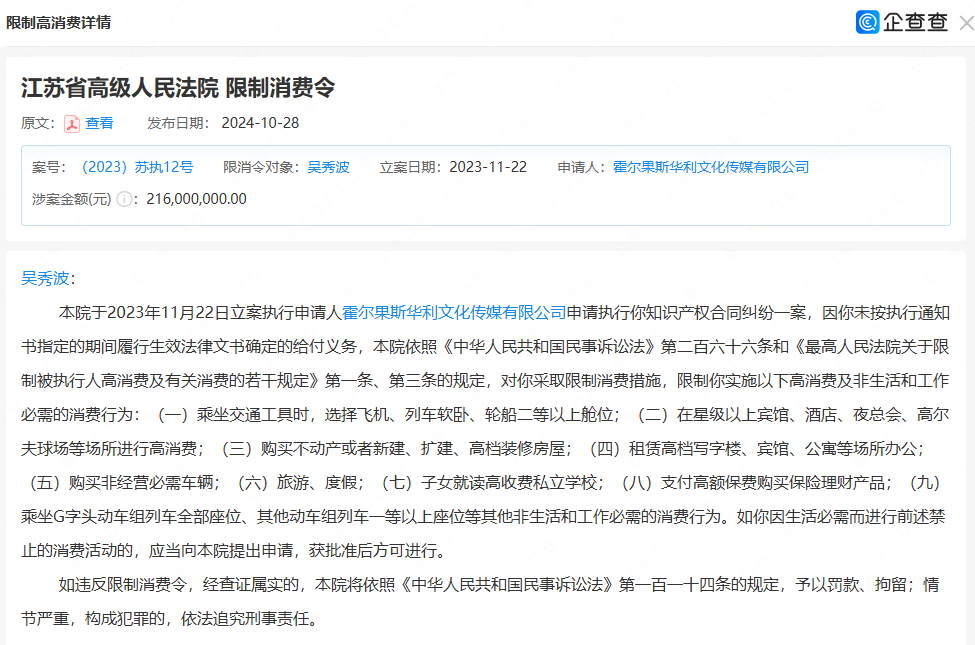 值得注意的是,目前,吳秀波仍關聯有與霍爾果斯華利文化傳媒有限公司知識產權合同糾紛一案,吳秀波因此案被限制高消費,并被列為失信被執行人,涉案金額2.16億元。