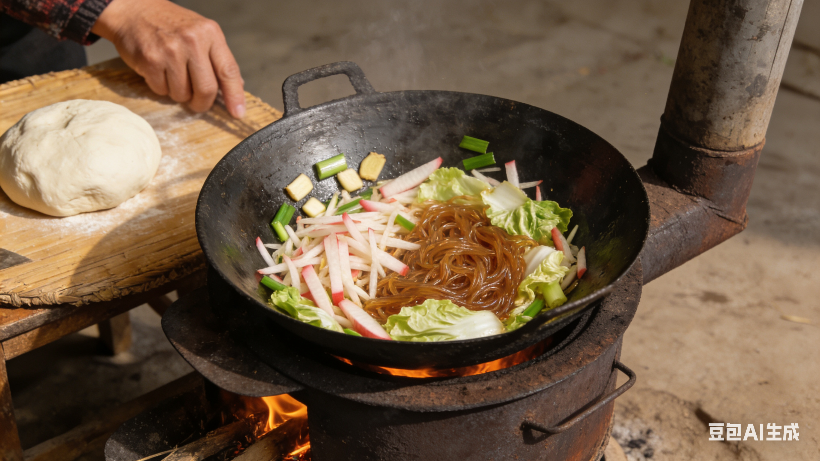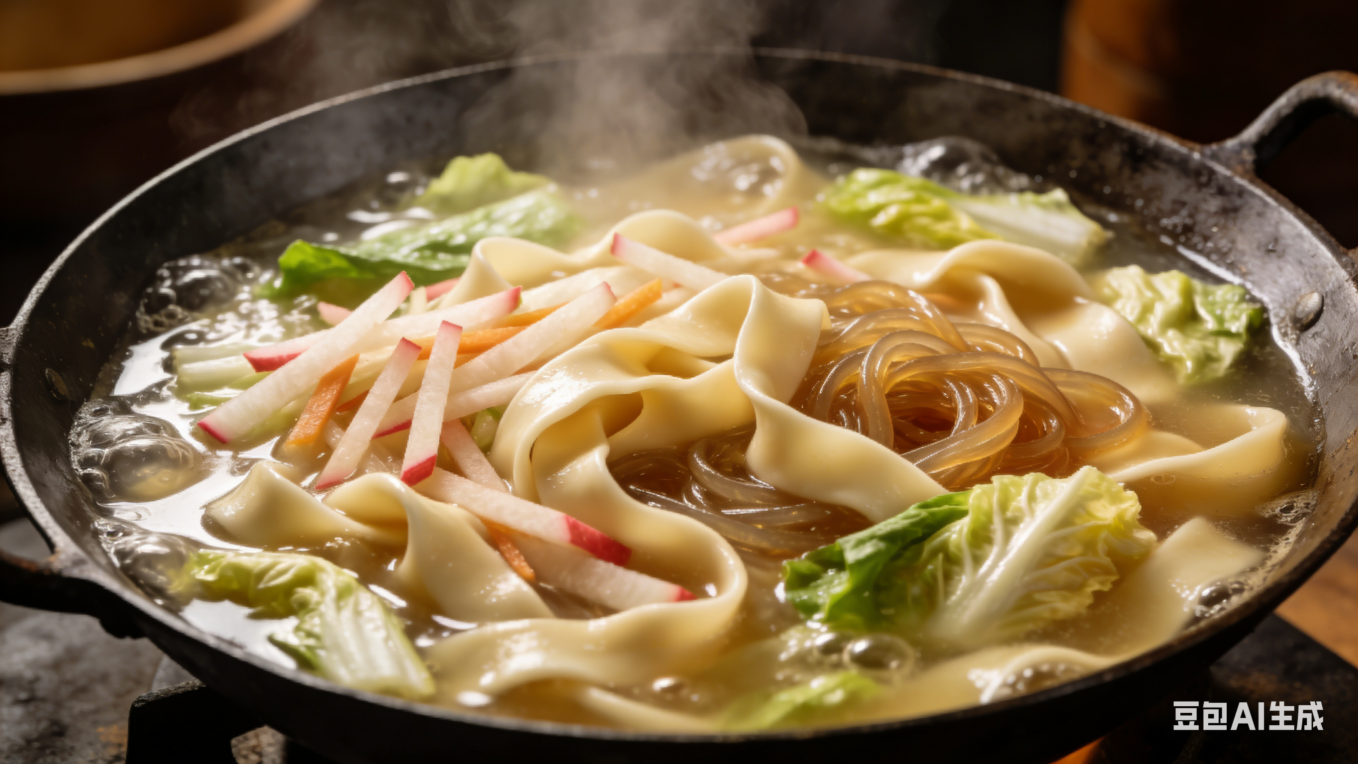 糊涂面條的“糊涂”,不在于做法敷衍,而在于食材的交融與隨性。鐵鍋燒熱,放少許油,將蔥姜爆香,再把蘿卜絲、白菜葉、紅薯粉條這類家常食材一股腦下鍋翻炒。添上滾燙的開水,等湯水咕嘟冒泡,便把和好的面團抻成寬窄不一的面條抖散下鍋,最后淋上一勺提前熬好的面湯,撒一把鹽和胡椒粉調味。講究些的人家,還會拌上一勺自制的辣椒油、芝麻醬,瞬間香氣四溢。