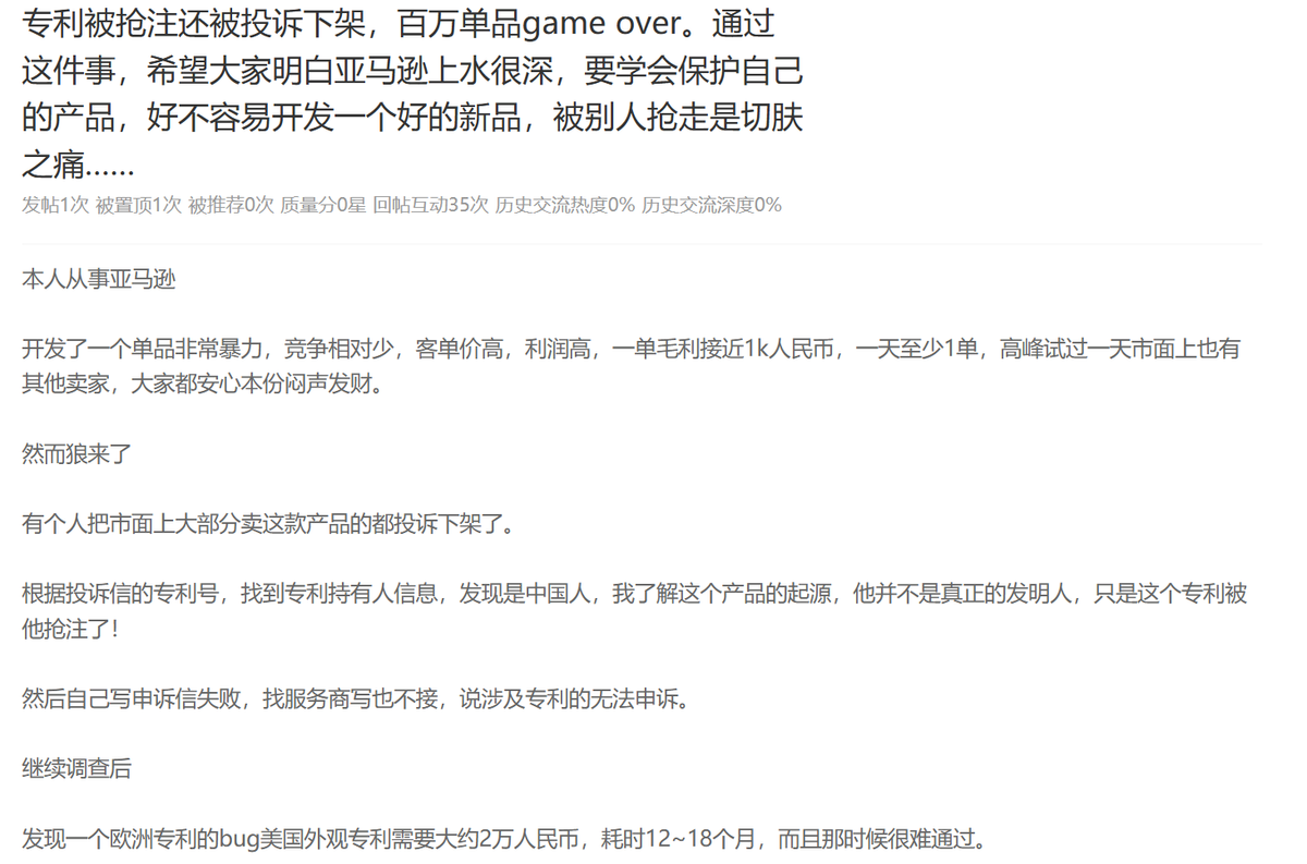 更過分的是,部分專利持有人或其代理律所采用“放水養(yǎng)魚”的策略:先默許產(chǎn)品銷售,待銷售數(shù)據(jù)積累后再突然發(fā)起訴訟并申請凍結賬戶,讓賣家陷入被動,迫使支付數(shù)千到上萬美元的和解金,遠超產(chǎn)品利潤。