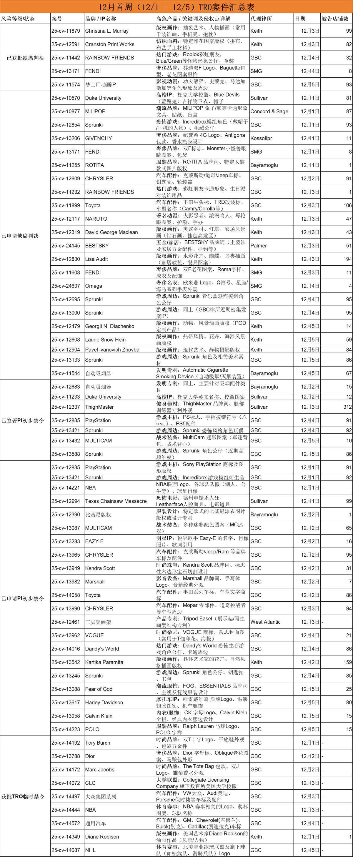 12月首周,美國法院維權節(jié)奏顯著提速,單周內(nèi)臨時限制令(TRO,Temporary Restraining Order)、初步禁令(PI,Preliminary Injunction)及缺席判決合計波及超過3500家店鋪,呈現(xiàn)出典型的多點爆發(fā)態(tài)勢。