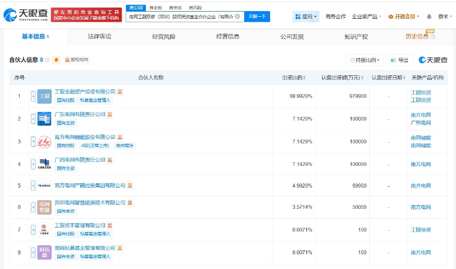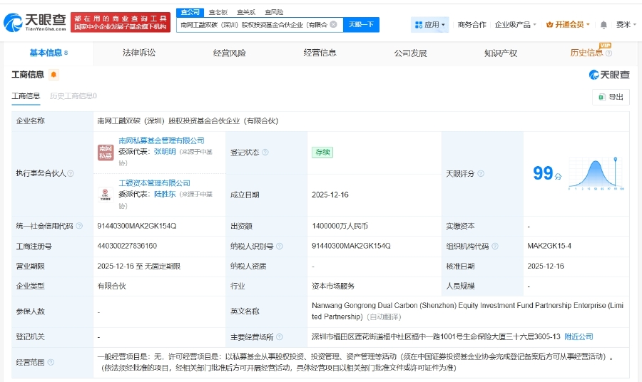 【大河財立方消息】天眼查App顯示,12月16日,南網工融雙碳(深圳)股權投資基金合伙企業(有限合伙)成立,執行事務合伙人為南網私募基金管理有限公司、工銀資本管理有限公司,出資額140億人民幣,經營范圍為以私募基金從事股權投資、投資管理、資產管理等活動,由工銀金融資產投資有限公司、南網儲能(600995)、 廣東電網有限責任公司等共同出資。