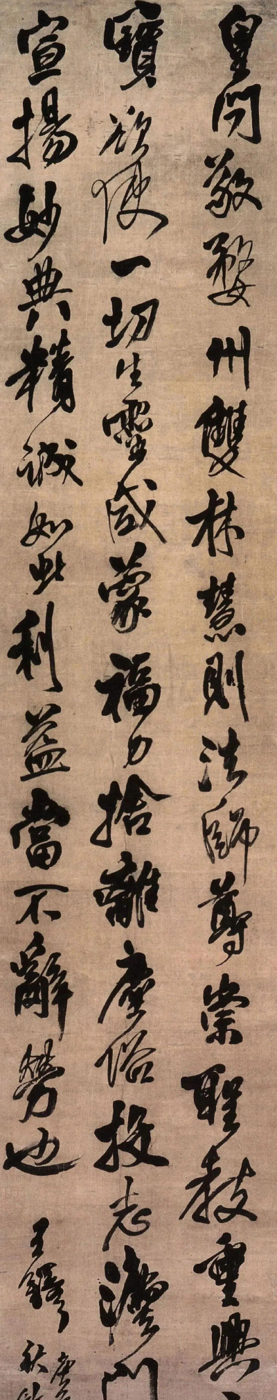 很多人覺得草書就是快,大錯特錯。王鐸這卷草書,是“變速跑”的典范。他有蓄勢待發的慢起筆,有電光石火的加速,也有戛然而止的急停。尤其是在長豎或長撇畫中,經常是先穩后快,在筆鋒將離紙面的瞬間達到最高速,留下一個尖銳而有力的“出鋒”。這種速度變化,直接決定了線條的質感。