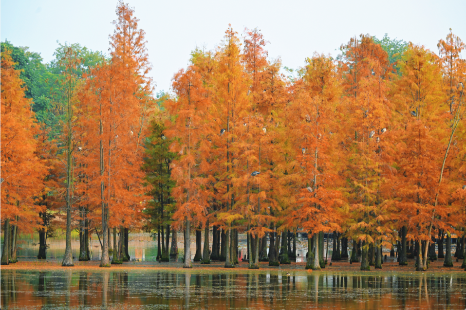 仰頭,水杉樹實景一片斑斕,低首,水杉樹映在水中的虛景,同樣是一片斑斕,這哪里是東呀?這分明就是實實在在的斑斕之秋。
