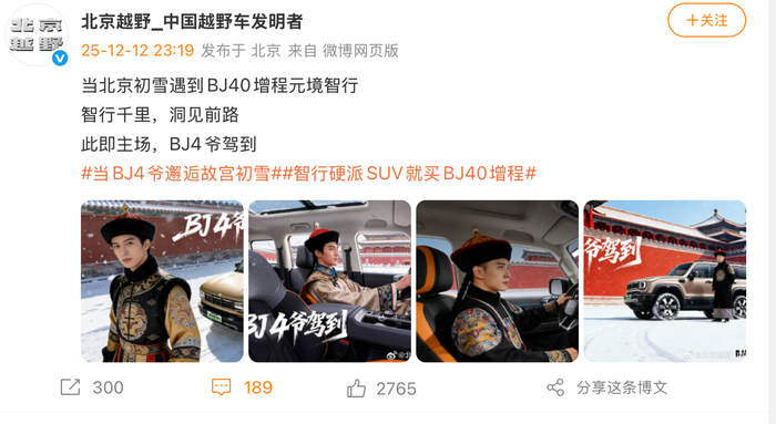 12月15日晚,北京越野在官方微博發(fā)了一組宣傳海報,為其BJ40增程版車型造勢,主題是“當BJ4爺邂逅故宮初雪”。海報里,身著清宮服飾、梳著長辮的模特和車一起出現(xiàn)在故宮背景前,配文寫著:“此即主場,BJ4爺駕到。”