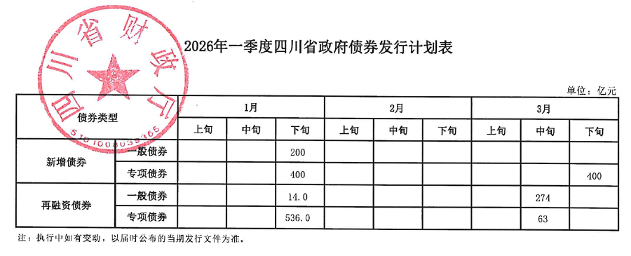 2026年一季度,四川省擬發行地方債1887億元,其中新增債券1000億元,再融資債券887億元。