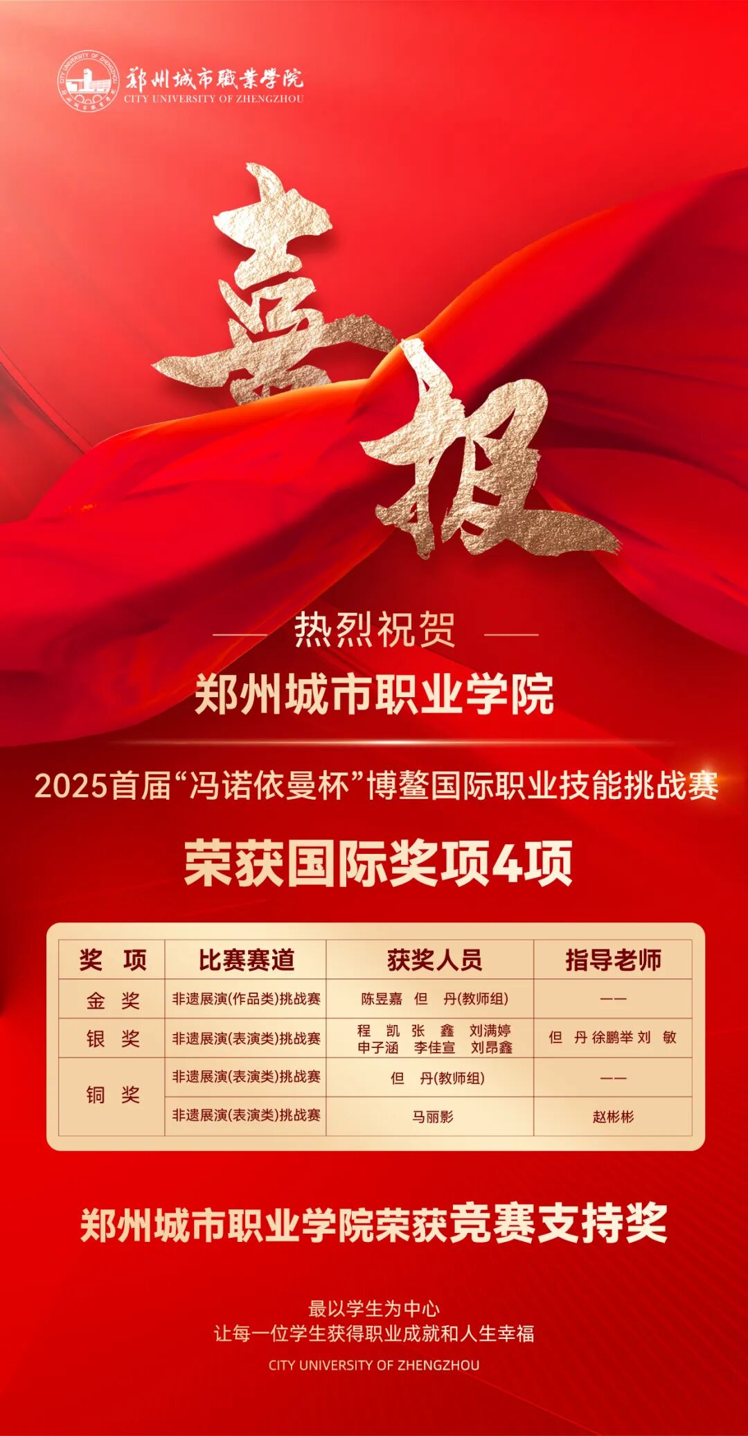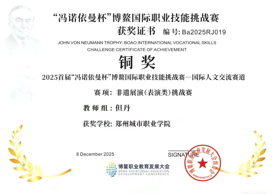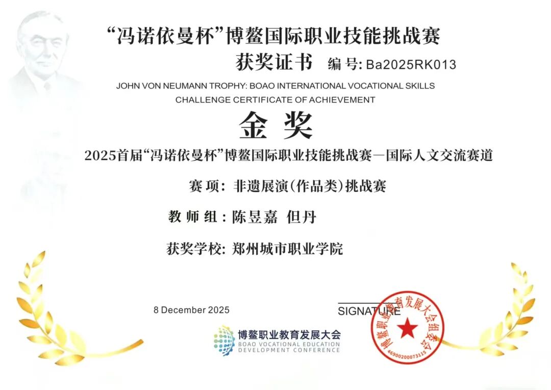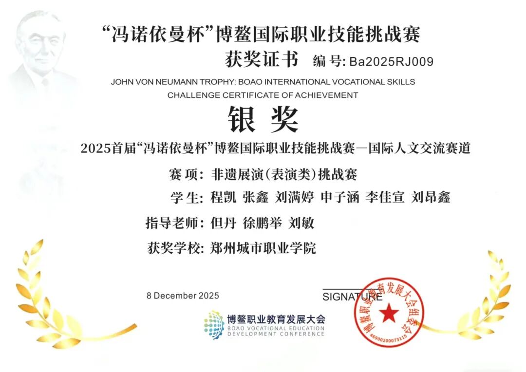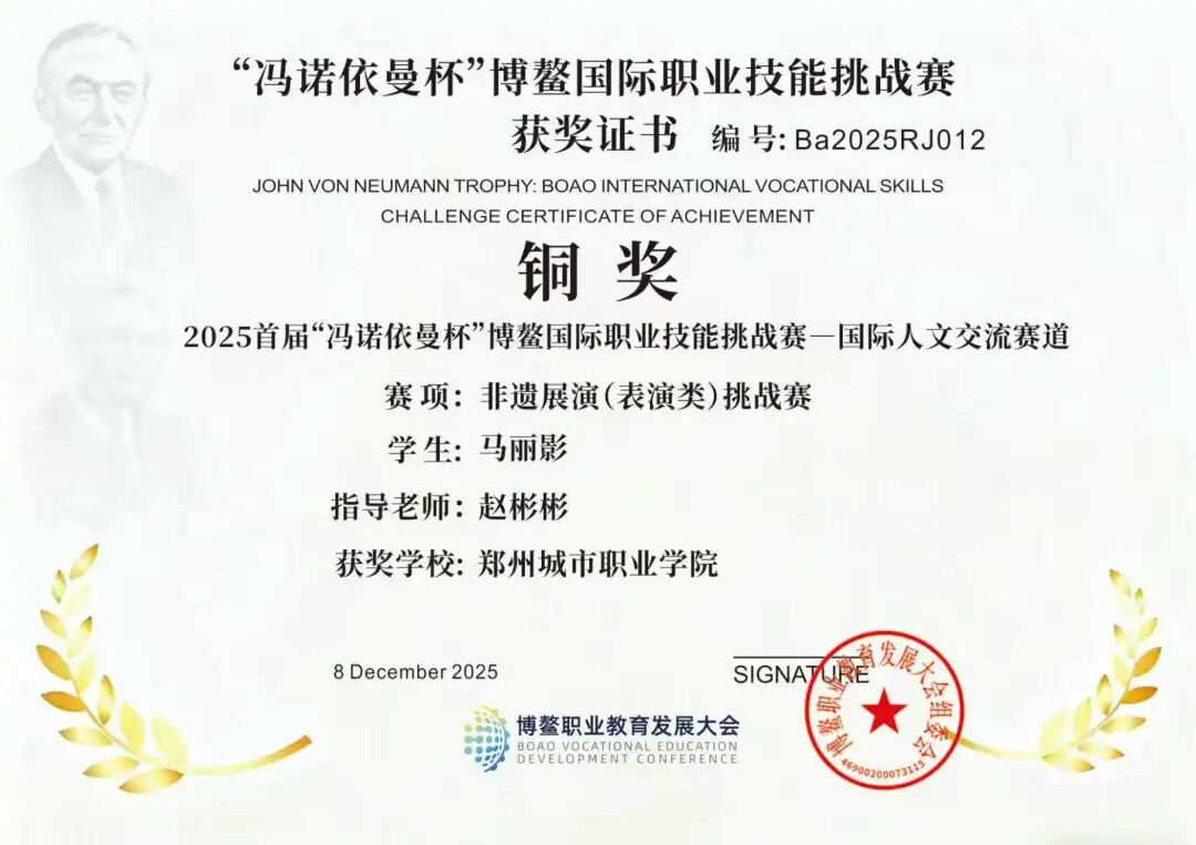 鄭州城市職業(yè)學(xué)院師生攜四大非遺精品,亮相同期舉辦的“馮諾依曼杯”博鰲國際職業(yè)技能挑戰(zhàn)賽:世界級非遺——中國書法、國家級非遺——古箏藝術(shù)與豫劇、省級非遺——詩經(jīng)古樂。參賽師生憑借深厚文化底蘊(yùn)與精湛技藝斬獲大獎:金獎1枚、銀獎1枚、銅獎2枚,學(xué)校更以出色的組織工作榮膺 “競賽支持獎”,讓河南職教風(fēng)采在國際舞臺綻放高光!