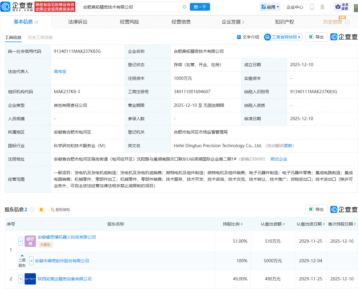 企查查APP顯示,近日,合肥鼎拓精密技術有限公司成立,法定代表人為蔣偉堅,注冊資本為1000萬元,經營范圍包含:發電機及發電機組制造;微特電機及組件銷售;電子元器件制造;集成電路制造;集成電路銷售等。企查查股權穿透顯示,該公司由中鼎股份(000887)全資子公司安徽睿思博機器人科技有限公司、陜西拓普達精密設備有限公司共同持股。