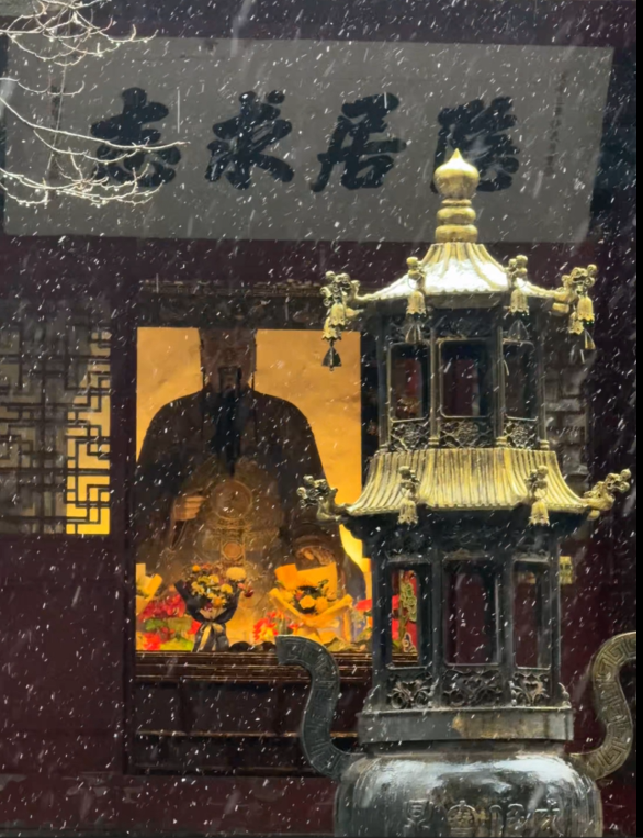 若遇落雪,整個武侯祠便成了詩意畫卷。白雪覆蓋在諸葛草廬的茅草頂上,郭沫若手書的“諸葛草廬”匾額在白雪映襯下愈發清晰;寧遠樓的飛檐掛著冰晶,隨風輕響,仿佛當年諸葛亮的琴聲仍在回蕩。此時在崗上高處遠眺,白雪皚皚的城景與祠內古建相映成趣,隨手一拍都是自帶氛圍感的大片。