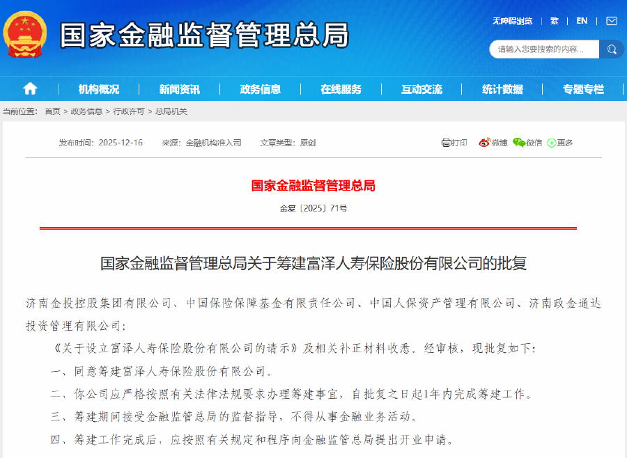 【大河財立方消息】12月16日,國家金融監督管理總局批復,同意濟南金投控股集團有限公司、中國保險保障基金有限責任公司、中國人保資產管理有限公司、濟南政金通達投資管理有限公司籌建富澤人壽保險股份有限公司。