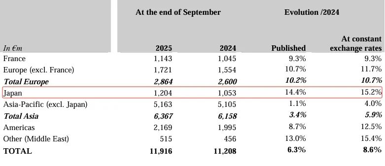 今年前三季度,愛馬仕日本市場總銷售額同比增長15.2%至12.04億歐元,遠高于亞太地區(除日本)、法國和美國。