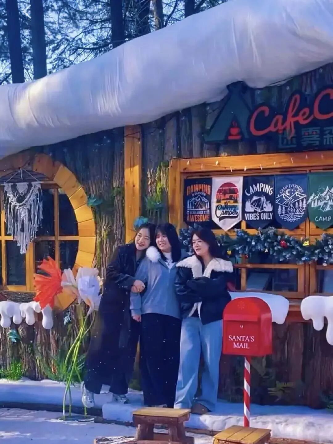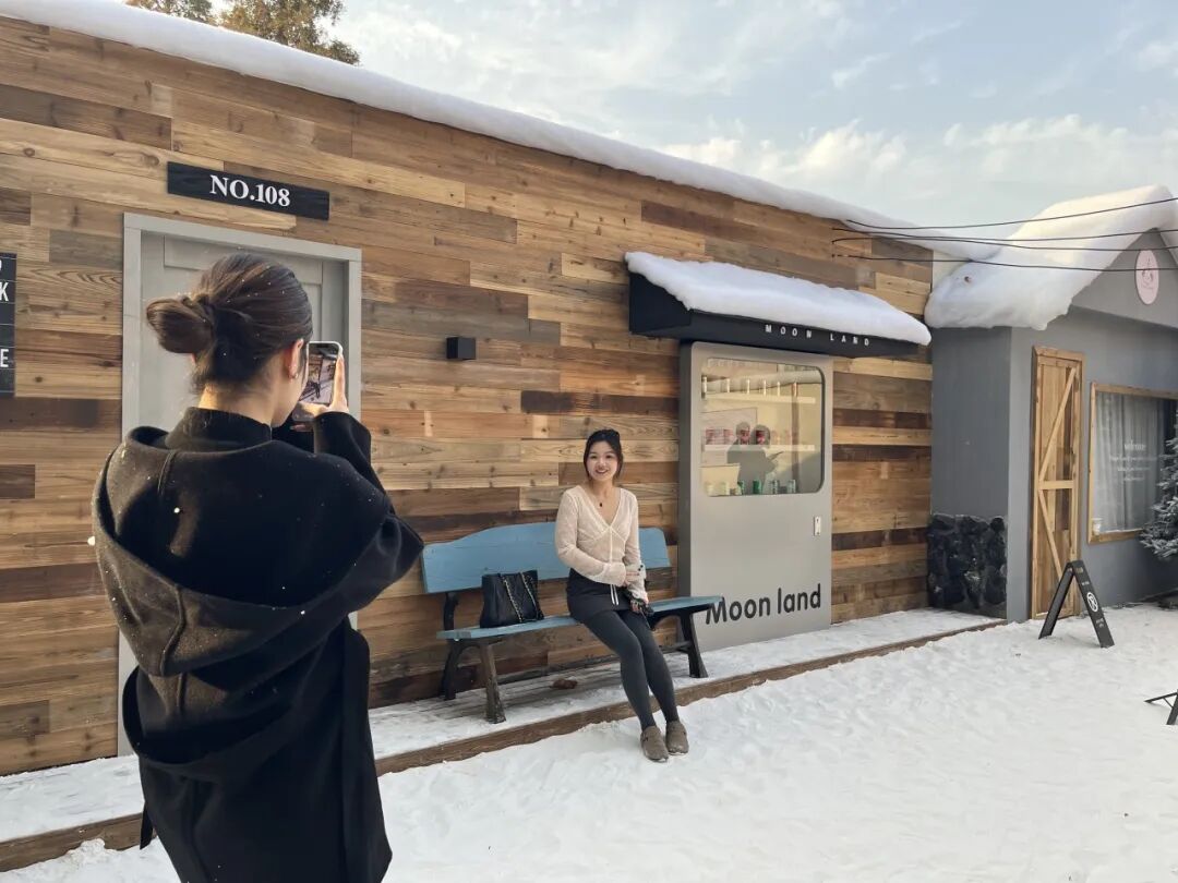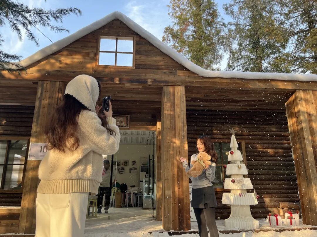 這里洋溢著濃郁的北歐風情,建筑外立面以紅杉木包裹,地面鋪滿白沙,院墻和屋頂用防火棉營造出積雪效果,仿真松樹上掛著可愛的玩具熊。每到整點,隨著屋頂的迷你造雪機運轉起來,“雪花”便紛紛揚揚地飄落下來,精心打扮的姑娘們在雪景中擺出優雅姿態,畫面夢幻而唯美。