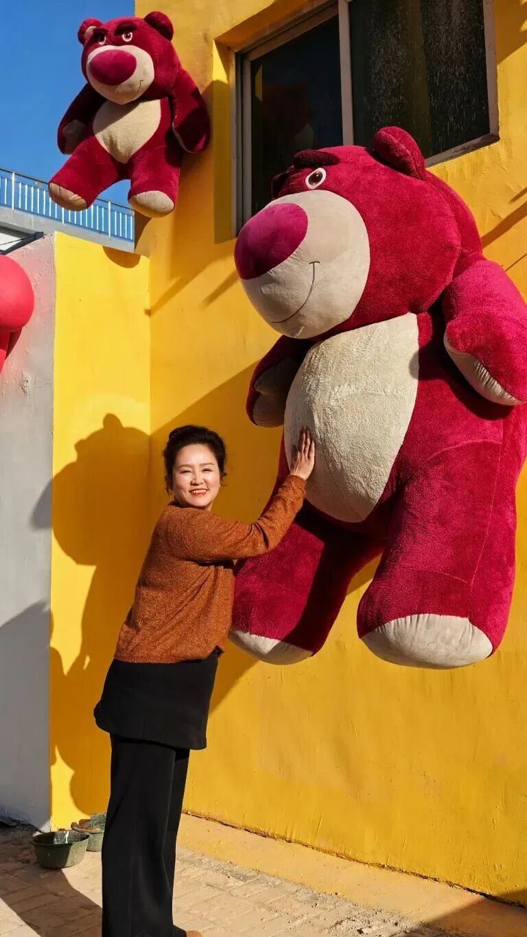 亮黃色墻面上裝飾著巨大的草莓熊,與最大的草莓熊互動、擁抱,仿佛闖入童話鎮。