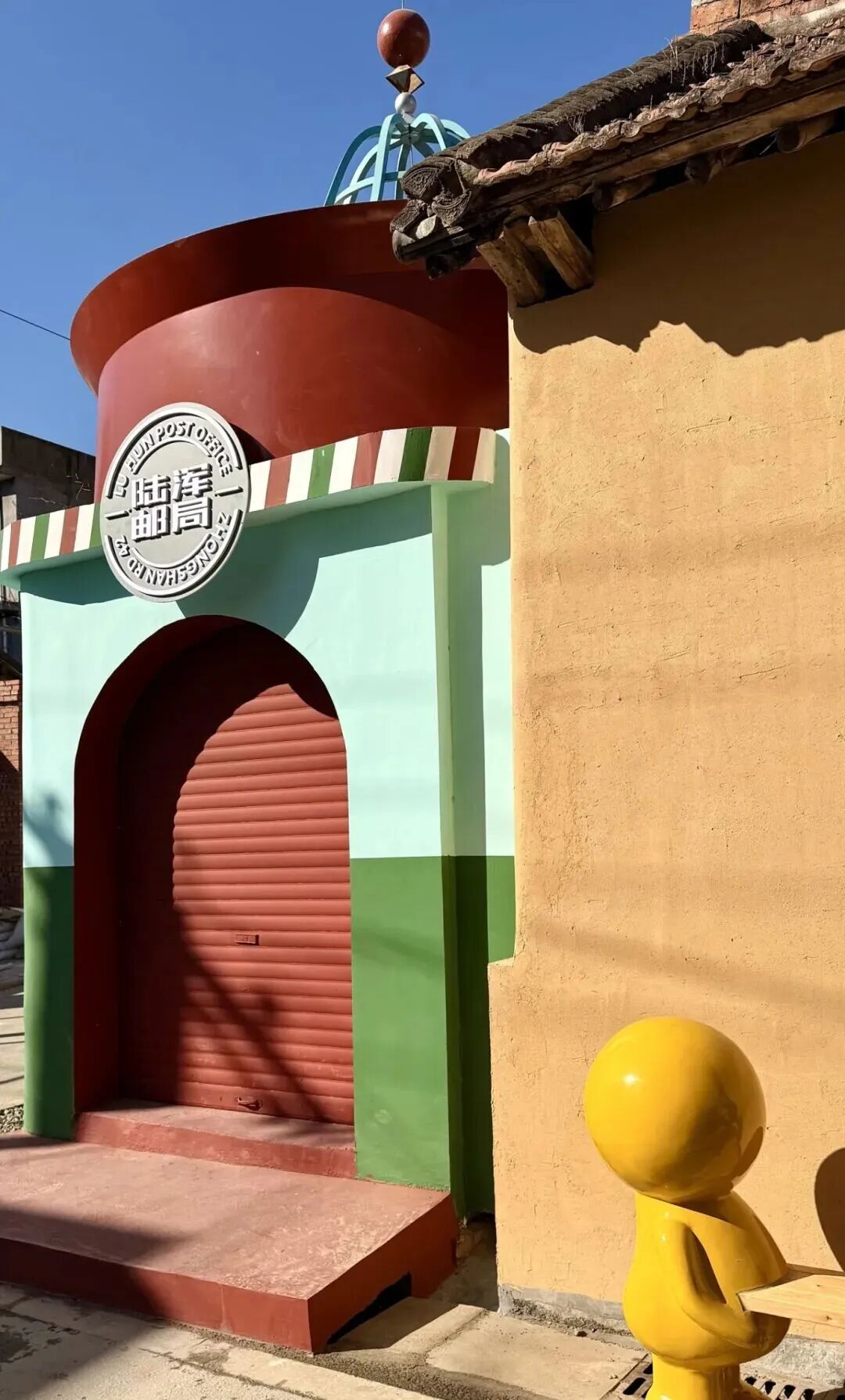 藍綠配色的建筑與紅色拱門的搭配極具復古感,“陸渾郵局”,提醒你身處最美的陸渾湖畔。