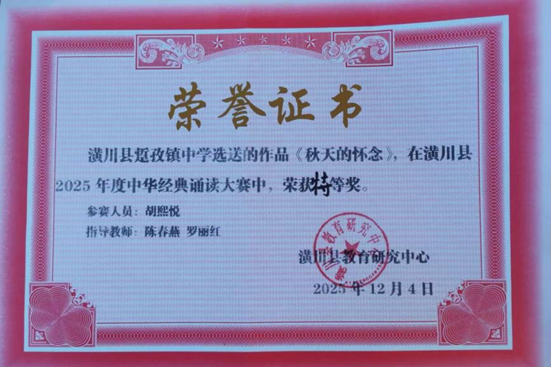 近日,備受矚目的潢川縣2025年度中華經典誦讀大賽在經過多輪激烈的比拼后圓滿落下帷幕。在最終的決賽中,潢川縣踅孜鎮中學學子胡熙悅憑借深厚的文化底蘊、精湛的誦讀技巧以及感人至深的舞臺演繹,從眾多優秀選手中脫穎而出,一舉斬獲本次大賽特等獎。這一優異成績的取得,不僅為學校贏得了榮譽,更充分彰顯了踅孜中學近年來深耕“書香校園”建設、落實立德樹人根本任務的豐碩成果。