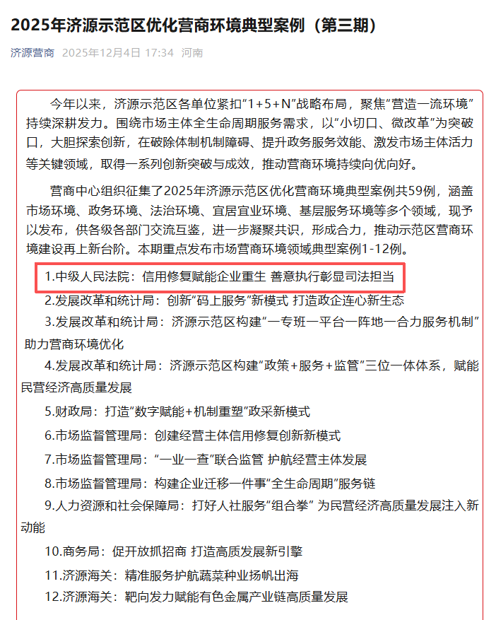 (三)聚多方合力、織共治網絡,搭建信用修復協同平臺。信用修復不是法院單干,而是社會共治。濟源兩級法院主動聯合發改委、市場監管局、人社局等部門,建立“信息互通、修復同步、獎懲聯動”的信用修復和正向信用激勵機制,共享企業信用修復數據,推動“修復即解凍”,讓企業在招投標、資質審批中不再因歷史失信被“一票否決”。《細則》施行以來,濟源兩級法院共屏蔽企業失信名單2148例,對836件涉企案件給予失信懲戒寬限期,最大限度減少執行活動對企業生產經營的影響。