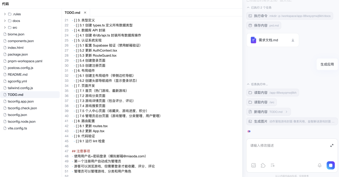 秒噠會先生成一份需求文檔。若無需修改,點擊“立即生成應用”即可: