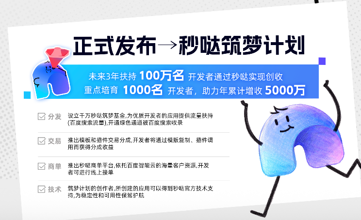 分發:設立千萬秒噠筑夢基金,為優質開發者的應用提供流量扶持(百度搜索流量),開通綠色通道被百度搜索收錄。