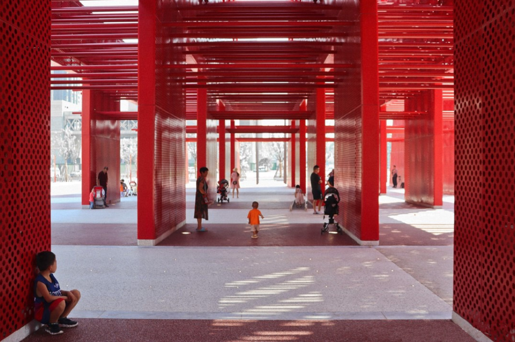 設計團隊從中國皮影戲中汲取靈感,將宏大磅礴的城門意象,解構為五片交錯聳立的藝術裝置。片與片之間形成的空間,市民可以自由穿行、嬉戲。