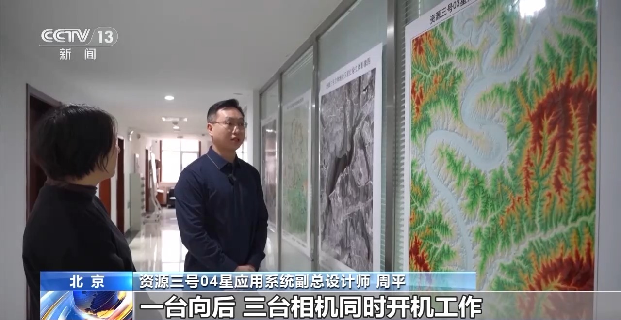 資源三號04星應用系統副總設計師 周平:衛星上面同時裝載了三臺相機拍攝,一臺向前,一臺垂直對地,一臺向后,三臺相機同時開機工作。一次成像能獲取一個地面物體三個方向的影像,構成一個立體影像。類似于我們拍3D電影的時候,三個相機從不同的角度拍同一個場景之后,我們就可以播放出3D的電影效果。