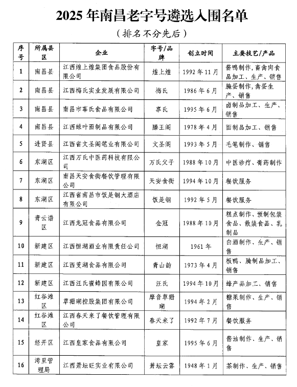 主營業務上,入圍企業涵蓋了畜禽肉食品加工、禽蛋生產、餐飲服務、面制品加工、毛筆制作、蜂產品加工、糖果生產等多個品類。從日常飲食所需的醬油、白酒、茶葉,到兼具養生與診療功能的中醫藥服務,再到承載文化內涵的毛筆制品,老字號們以多樣的產品與服務,深度融入市民生活,成為南昌商業文明與市井煙火氣的鮮活載體。