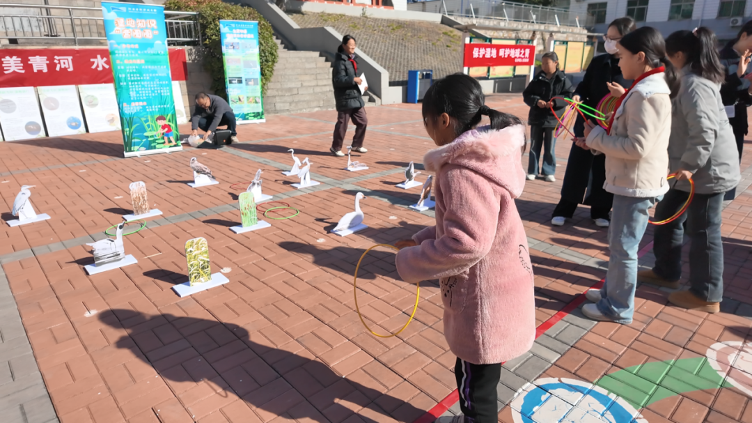 走出課堂,操場上的濕地生態保護主題游戲同樣熱鬧非凡。“濕地動物套圈圈”“保護濕地投壺挑戰”等趣味游戲,將濕地生物多樣性、生態保護常識融入其中。同學們在歡聲笑語中記住了濕地里的珍稀動植物,理解了“保護濕地就是保護我們自己”的深刻內涵。有學生興奮地說:“今天不僅學到了知識,還玩得特別開心!以后要和家人一起守護身邊的濕地。”