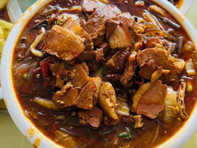 攬鍋菜的精髓在于“燴”的藝術與食材的考究:選用肥瘦相間的本地土豬五花肉,煸炒至金黃出油,逼出油脂后肥而不膩;豆腐選用石磨老豆腐,煎至外焦里嫩,能充分吸附肉香與湯汁;粉條是本地手工紅薯粉,泡發(fā)后爽滑勁道,不易煮爛;再搭配時令青菜、海帶絲,讓營養(yǎng)更均衡。烹飪時用秘制醬料打底,加入十余種香料炒出香味,再兌入骨湯小火慢燉,讓食材在咕嘟聲中充分交融,湯汁濃稠鮮亮,醬香濃郁撲鼻。出鍋時撒上蔥花、香菜,五花肉酥爛入味,豆腐吸飽湯汁,粉條裹著肉香,每一口都是層次豐富的家鄉(xiāng)味。