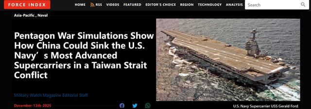 最近,美國媒體自己捅出了一個(gè)“大雷”。據(jù)《紐約時(shí)報(bào)》、《軍事觀察雜志》等多家美媒披露,一份原本只在白宮和五角大樓高層內(nèi)部流轉(zhuǎn)的機(jī)密兵棋推演評(píng)估文件——《優(yōu)勢(shì)簡(jiǎn)報(bào)》(Overmatch Brief)意外外泄。而這份文件給出的結(jié)論,可以說是直接戳破了美國海軍幾十年來精心維護(hù)的“航母無敵神話”:在多輪臺(tái)海沖突兵推中,中國有相當(dāng)高的概率,在美軍空中力量尚未發(fā)揮作用之前,就徹底癱瘓甚至擊沉美軍最引以為傲的“杰拉爾德·R·福特”號(hào)航母。
