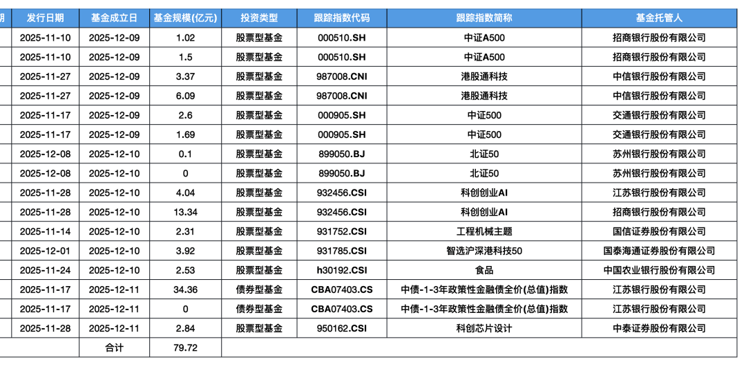 本周成立的指數(shù)基金募集規(guī)模合計79.72億元,主要由債券ETF和科創(chuàng)主題產(chǎn)品貢獻。