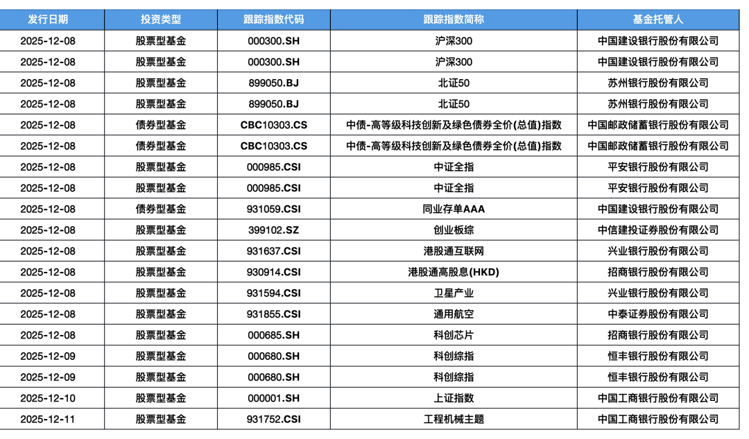 按照基金托管人來看,2025年以來成立的指數(shù)基金中,發(fā)行規(guī)模合計最大的是興業(yè)銀行,達887.98億元,其中債券型基金628.9億元;托管新發(fā)股票型基金規(guī)模最大的是中國建設(shè)銀行,首發(fā)規(guī)模合計606.62億元。