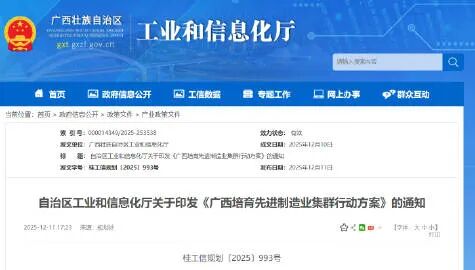 12月11日,廣西壯族自治區工業和信息化廳印發《廣西培育先進制造業集群行動方案》。根據《行動方案》可知,力爭到2027年,建成1個國家級先進制造業集群、20個自治區級先進制造業集群。