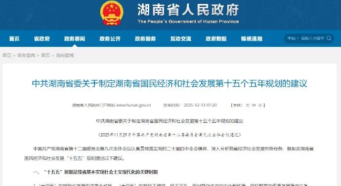 12月12日,中共湖南省委關于制定湖南省國民經濟和社會發展第十五個五年規劃的建議發布。