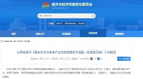 12月11日,重慶市經濟信息委印發《重慶市支持未來產業培育發展若干措施(征求意見稿)》征求社會意見。