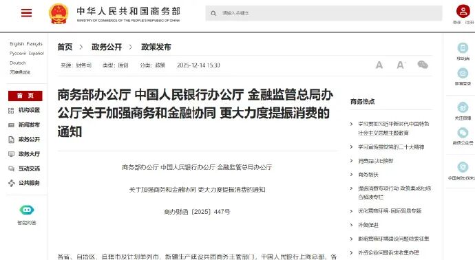 12月14日,商務部辦公廳、中國人民銀行辦公廳、金融監管總局辦公廳發布《關于加強商務和金融協同,更大力度提振消費的通知》。