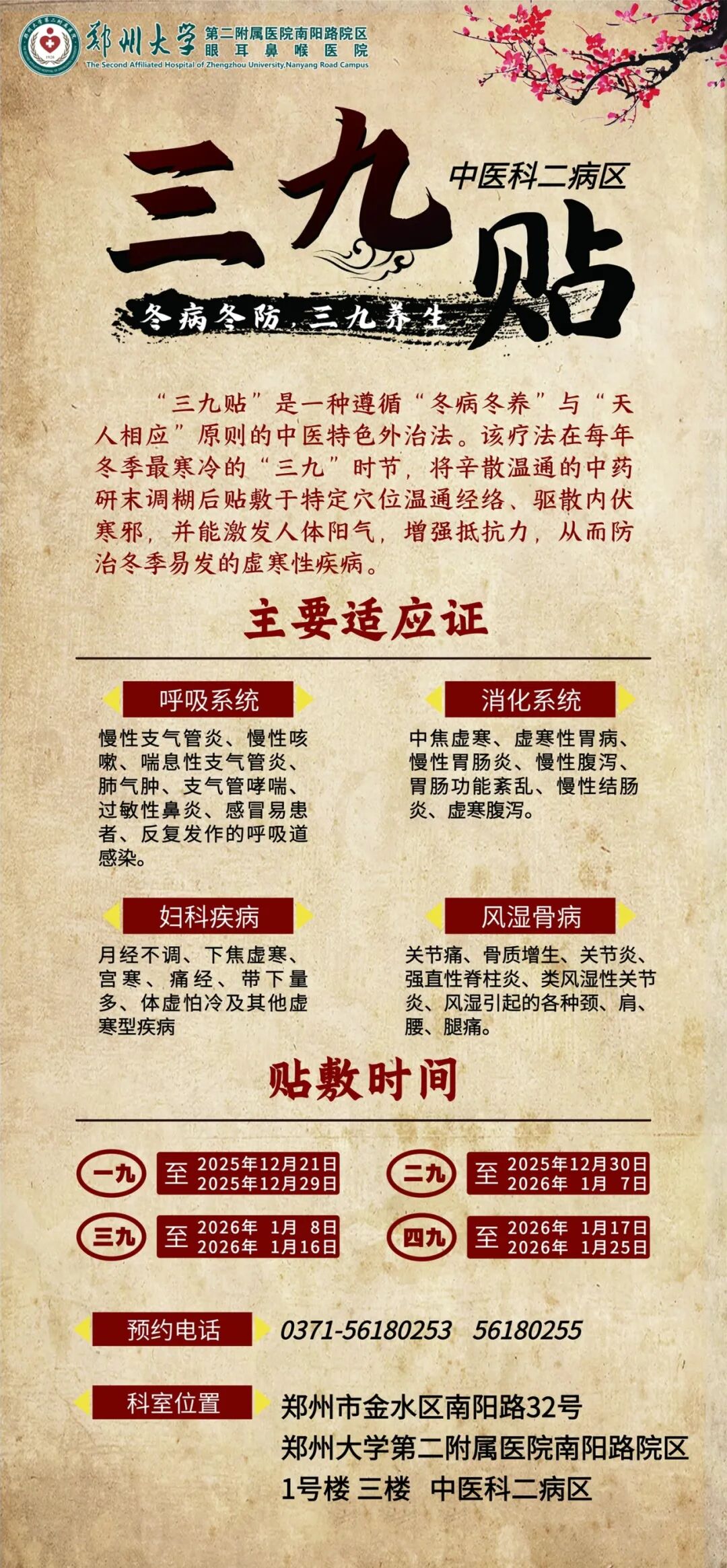 冬至一陽(yáng)生,三九補(bǔ)一冬。隨著“三九天”的臨近,一年中溫補(bǔ)陽(yáng)氣、調(diào)理虛寒體質(zhì)的黃金時(shí)節(jié)也隨之到來(lái)。我院中醫(yī)科二病區(qū)“三九貼”現(xiàn)已開(kāi)啟預(yù)約,助您暖心過(guò)冬,為健康蓄力。
