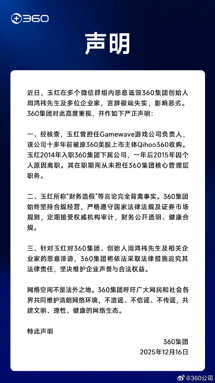 12月16日,360集團(tuán)發(fā)布關(guān)于玉紅惡意詆毀360集團(tuán)創(chuàng)始人周鴻祎先生的嚴(yán)正聲明: