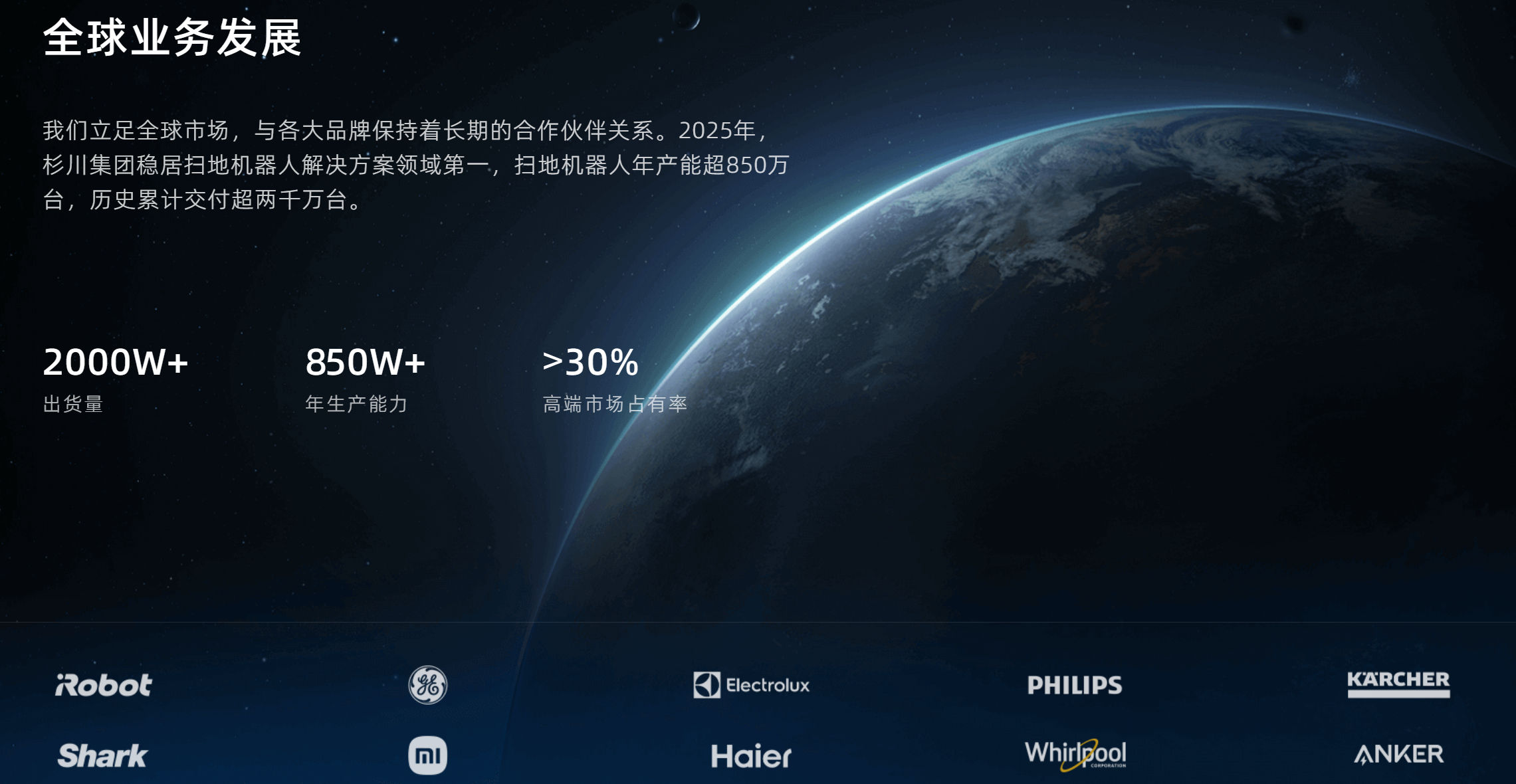 杉川官網顯示,這家成立于2016年的公司主營業務之一是掃地機器人解決方案。除了iRobot,官網列出的合作伙伴還有飛利浦、小米、海爾、惠而浦、安克等。2025年,杉川穩居掃地機器人解決方案領域第一,掃地機器人年產能超850萬臺。