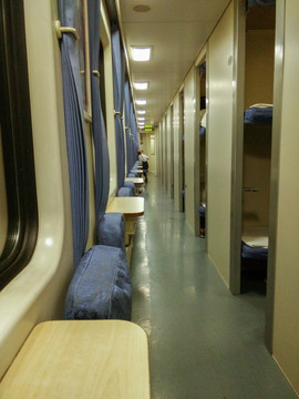 車內燈光昏黃黯淡,伴隨著列車行駛時發出有節奏的“哐當”“咣當”聲,乘客們在這單調的節奏中,漸漸進入了夢鄉。