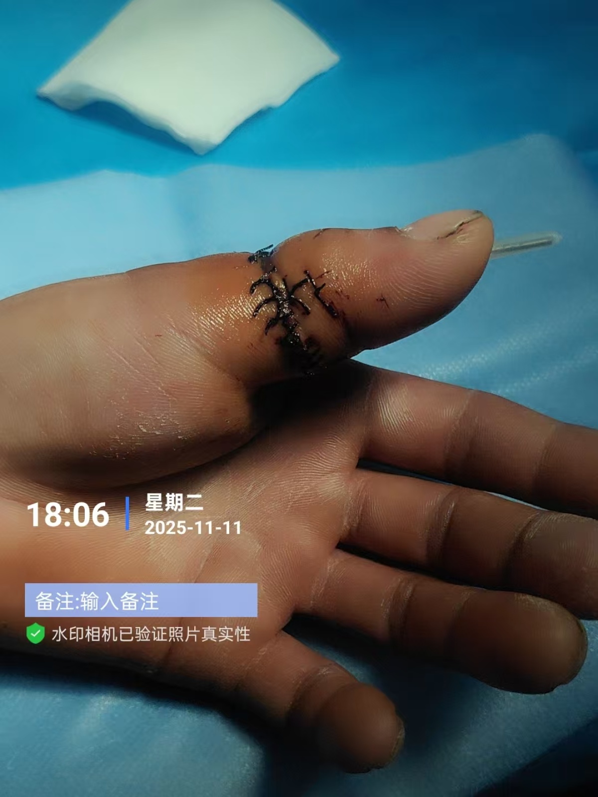 12月15日,記者聯系到李先生,他介紹,10月28日下午,他當時在鄭州璞云別院項目1號樓8層室內做防水時,“可能方木比較潮濕,不小心電鋸反彈了一下”,導致左手大拇指被鋸掉四分之三,僅剩一層皮沒完全分離,被人送到了醫院。因受傷過重后轉院做手術,前后花費2.7萬元。