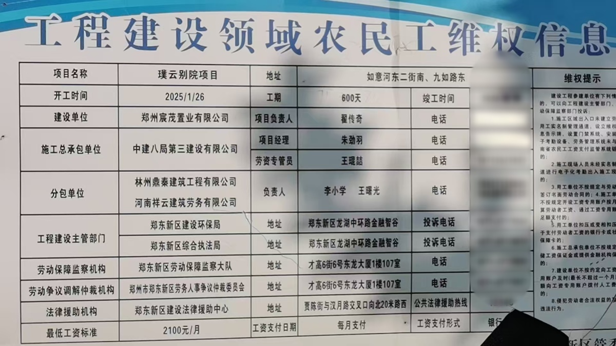 璞云別院項目工程建設領域農民工維權信息公示牌顯示,建設單位是鄭州辰茂置業有限公司,施工總承包單位為中建八局第三建設有限公司。分包單位林州鼎秦建筑工程有限公司和河南祥云建筑勞務有限公司。